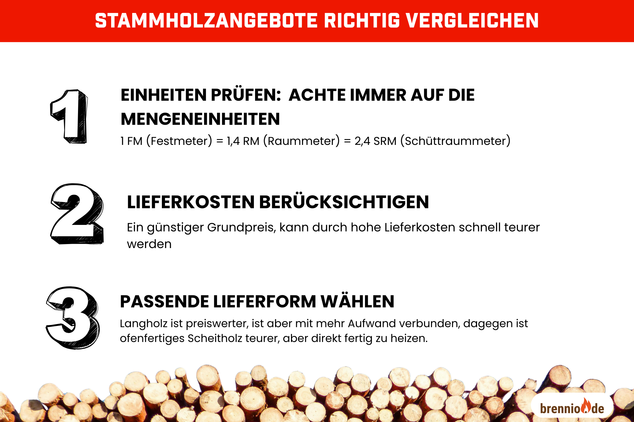 Bevor Sie Stammholz kaufen, lohnt es sich, Angebote sorgfältig zu vergleichen, um den besten Preis zu erzielen und böse Überraschungen bei Lieferung oder Verarbeitung zu vermeiden. In dieser Übersicht sehen Sie am besten, wie Sie vorgehen sollten.