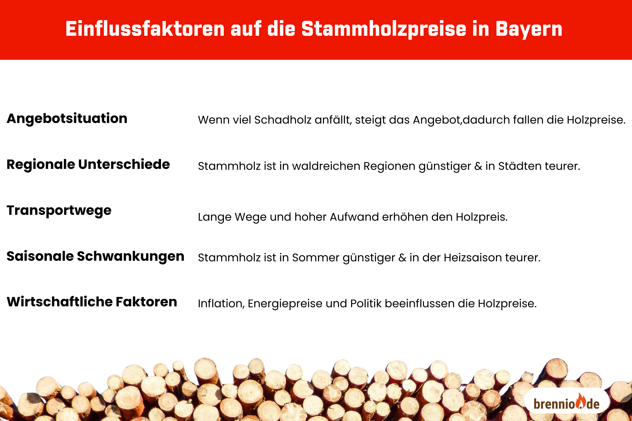 Für Bayern kommen zu der allgemeinen Marktlage ebenfalls regionale Faktoren hinzu. Da die Waldverteilung innerhalb des Bundeslandes unterschiedlich ist, stammen viele Lieferungen in Ballungsgebiete wie München oder Nürnberg aus entfernten Forstregionen, z. B. Oberfranken oder der Oberpfalz. Transport- und Logistikkosten wirken sich daher auf die Endpreise aus, besonders bei größeren LKW-Lieferungen von Stammholz.