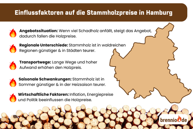 Für den Großraum Hamburg kommen zu dieser allgemeinen Marktlage regionale Faktoren hinzu. Da das Stadtgebiet selbst nur geringe Waldflächen hat, stammt ein Großteil des Stammholzes aus Niedersachsen und Schleswig-Holstein und wird in das Umland oder direkt in die Stadt geliefert. Kosten für Transport und Logistik schlagen sich entsprechend in den Endpreisen nieder.