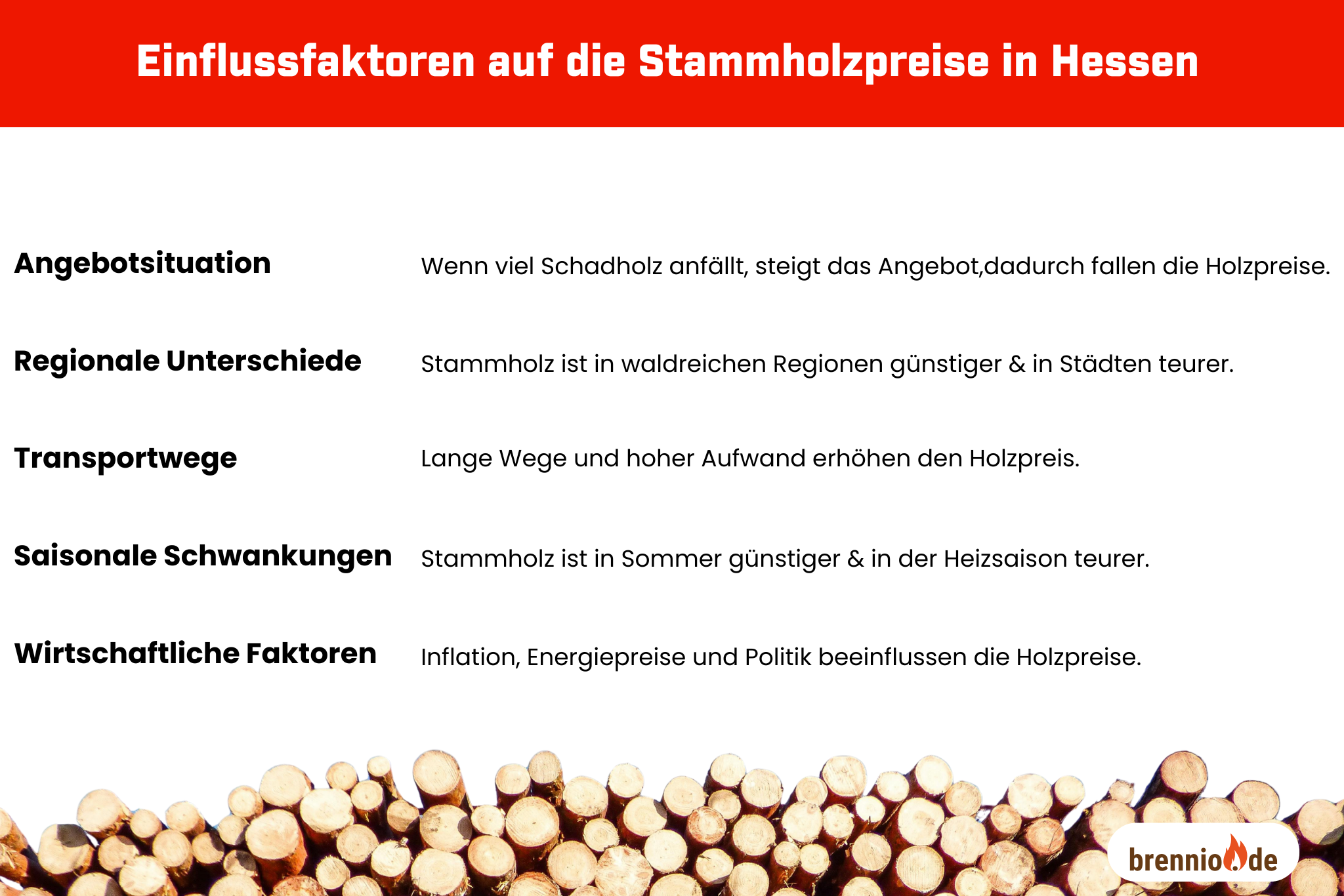 In Hessen wirken neben bundesweiten Faktoren vor allem regionale Gegebenheiten. Ballungsräume wie Frankfurt, Wiesbaden, Darmstadt oder Kassel werden häufig aus stärker bewaldeten Regionen wie Odenwald, Kaufunger Wald oder Knüll beliefert, was Transport- und Lieferkosten erhöhen kann.