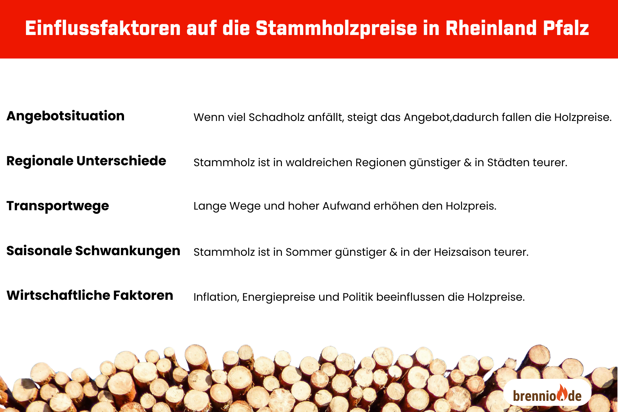 Für Rheinland-Pfalz spielen neben den bundesweiten Marktbedingungen vor allem regionale Gegebenheiten eine wichtige Rolle. Die Waldverteilung ist nicht überall gleich, sodass Ballungsräume wie Mainz, Ludwigshafen, Koblenz oder Trier häufig aus stärker bewaldeten Regionen wie Hunsrück, Westerwald oder Pfälzerwald beliefert werden. Diese Herkunftswege können Transport- und Lieferkosten erhöhen.