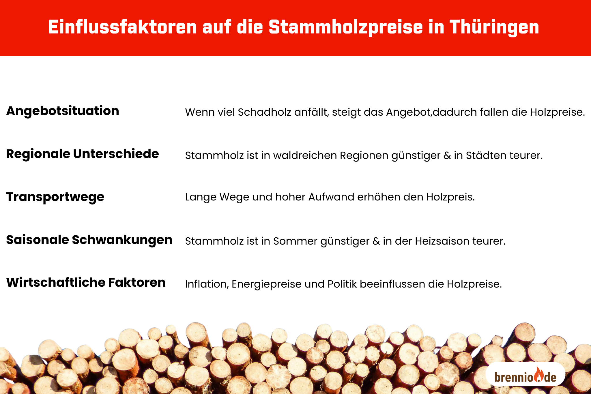 Für Thüringen spielen neben der allgemeinen Marktentwicklung regionale Besonderheiten eine wichtige Rolle. Waldflächen sind ungleich verteilt, wodurch Ballungsräume wie Erfurt, Jena oder Gera oft aus weiter entfernten Forstregionen beliefert werden müssen, z. B. Thüringer Wald oder Eichsfeld. Längere Transportstrecken erhöhen die Logistik- und Lieferkosten, besonders bei LKW-Lieferungen.